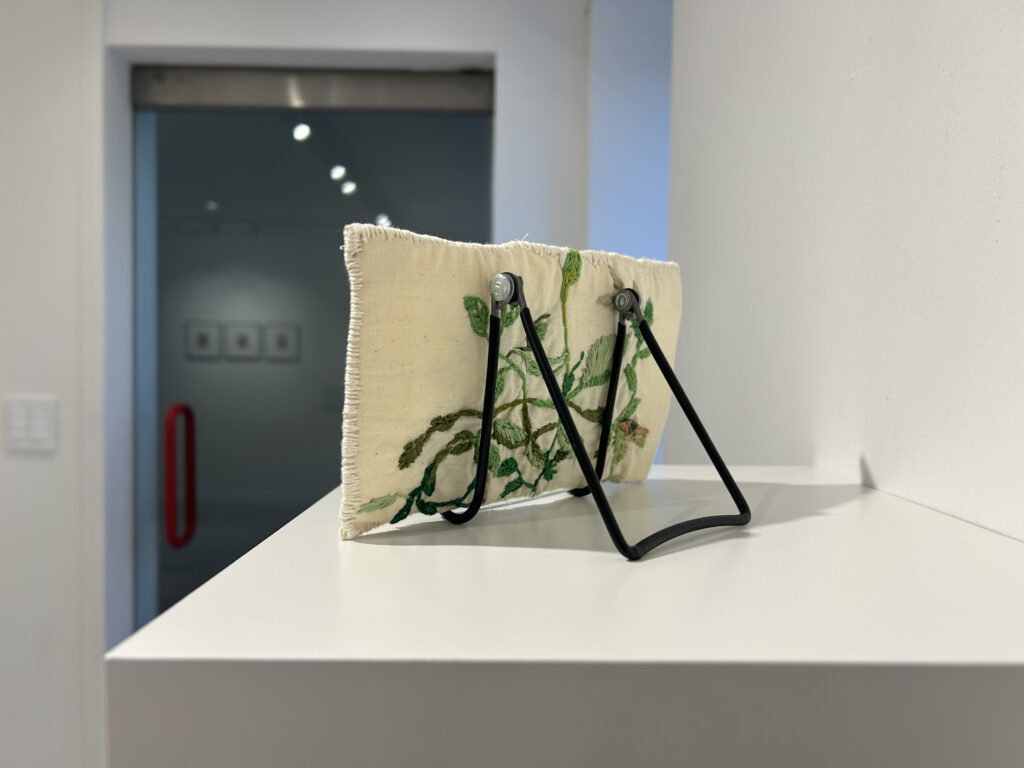 #fetalposition. 2023. Embroidery, beading, plant mono-prints, appliqué and plant-dyed threads on fabric. 40 x 20 x 1.5 inches.