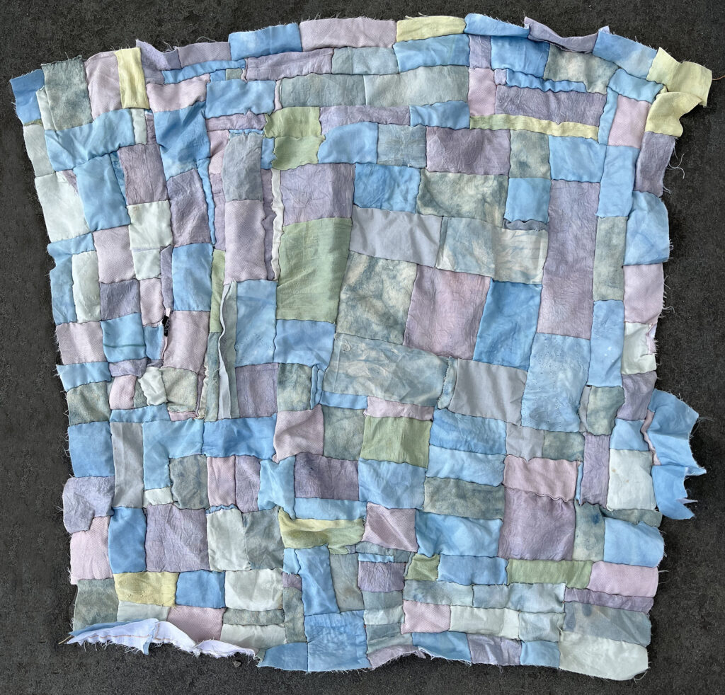 Many Shades of Indigo. 2018-2022. Pieced silk and cotton fabrics dyed with indigo grown at GrowNYC’s Governors Island Teaching Garden; Washington Park, Brooklyn; Wyckoff Farm, Brooklyn; and a family garden; lightweight interfacing. 26 x 28.25 inches.