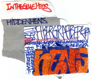 Recycled Hens. 2010. Embroidery on graffiti on recycled envelopes. Embroidery: Iviva Olenick; Graffiti: Jon Baker. 7.75″ X 8.5″