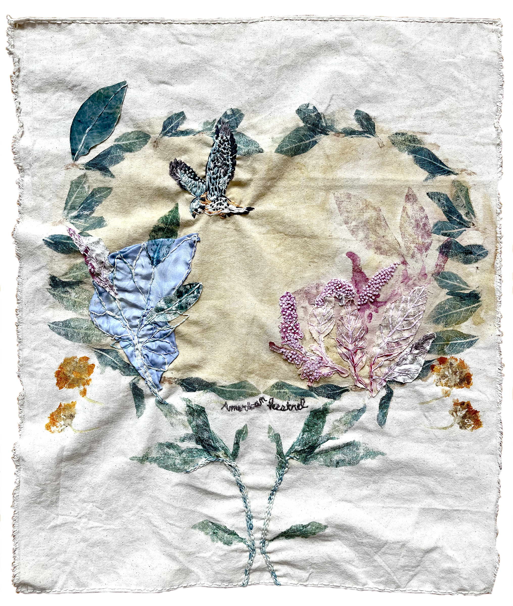 American kestrel. 2025. Mixed media painting with sulfur cosmos, indigo and red amaranth leaf prints; red amaranth ink; anthotype on purple cabbage on silk; appliqué and embroidery with silk and cotton fabrics. 22 x 19 inches. Pin It