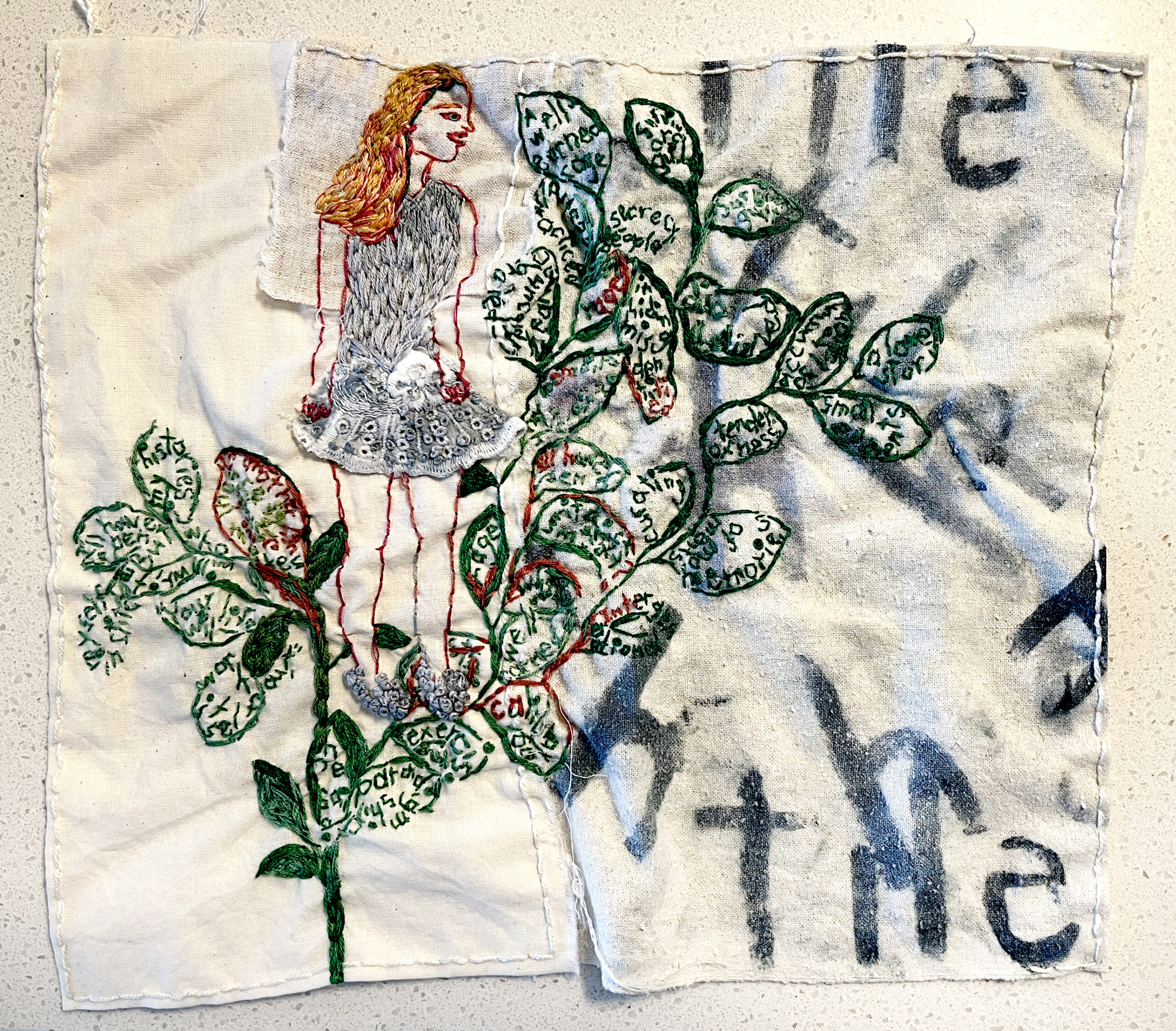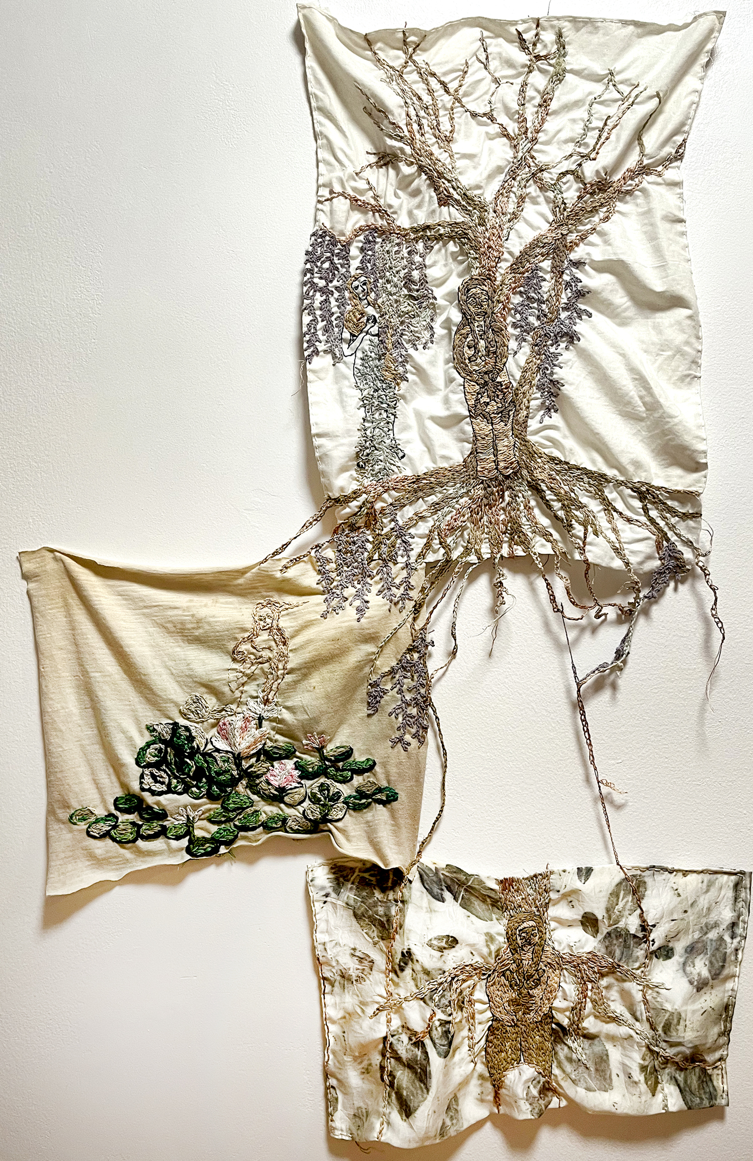 Of Myths of Plants and Women. 2023. Embroidered Triptych with plant dyes and mono-prints, embroidery, crochet. Inspired by 2023 Wave Hill Winter Workspace Artist residency. 43 x 30 x 2 inches. Pin It