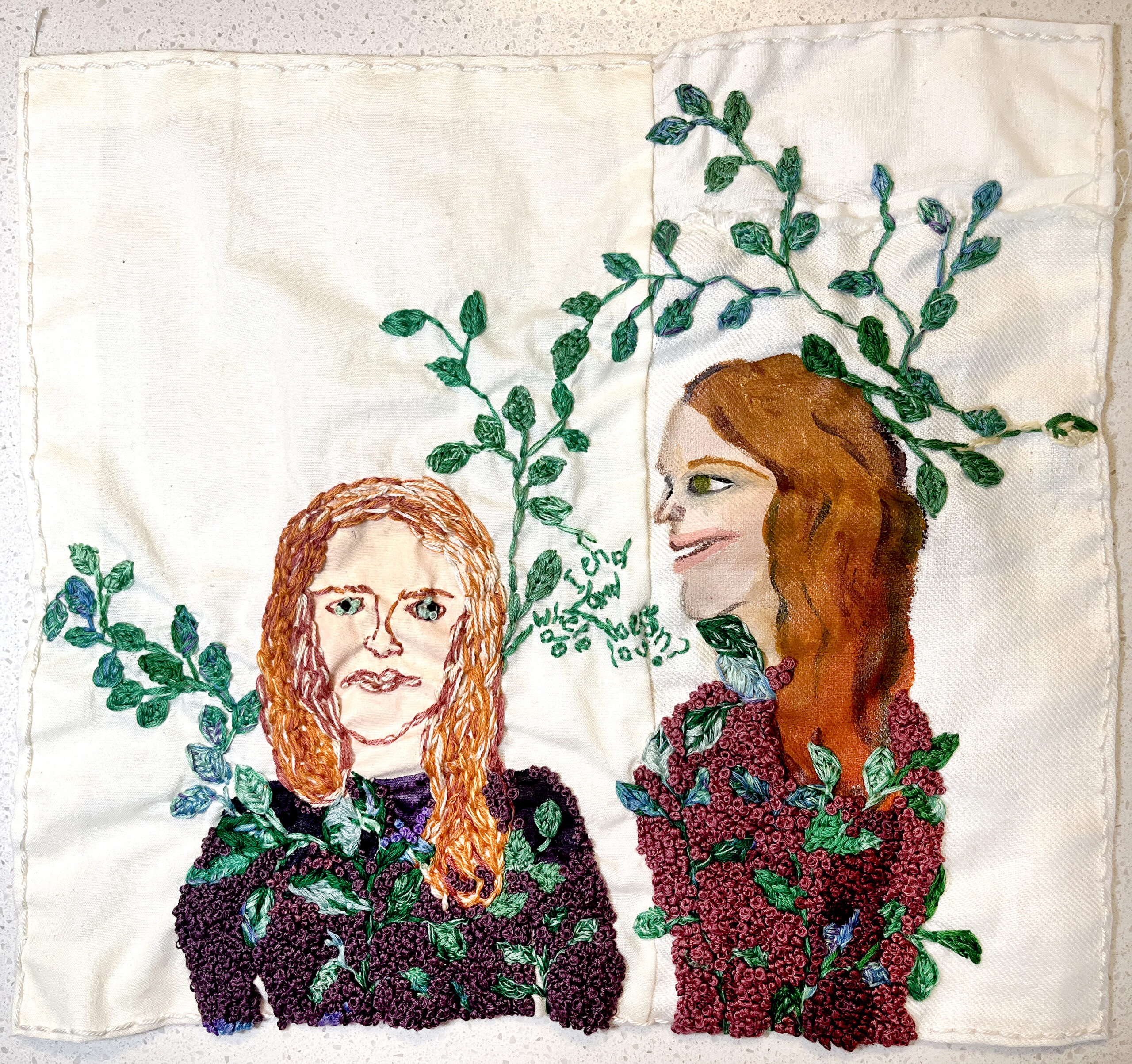 Where do I end and you begin? 2025. Acrylic paint and embroidery on pieced fabric. 11 x 12 inches. Pin It