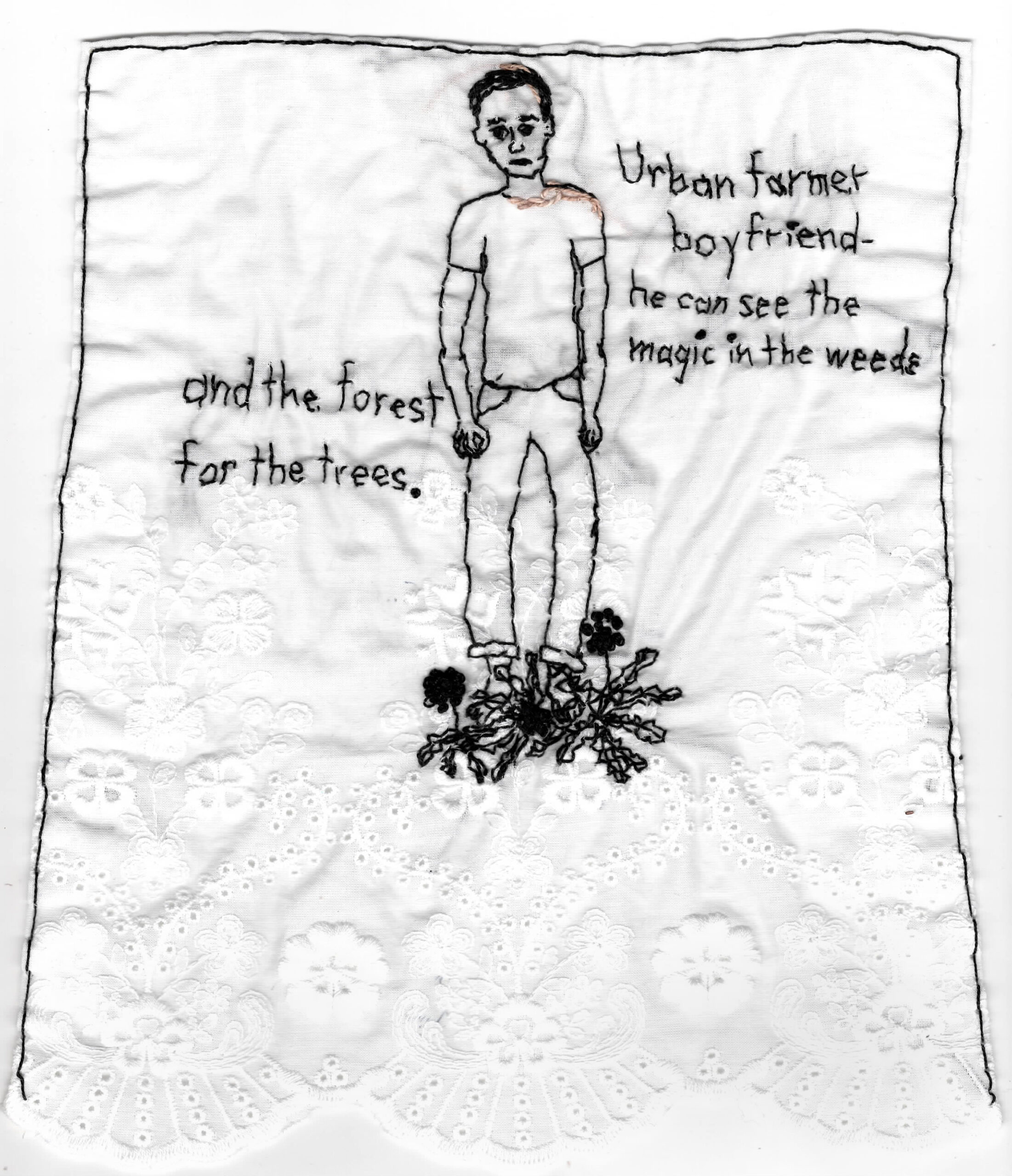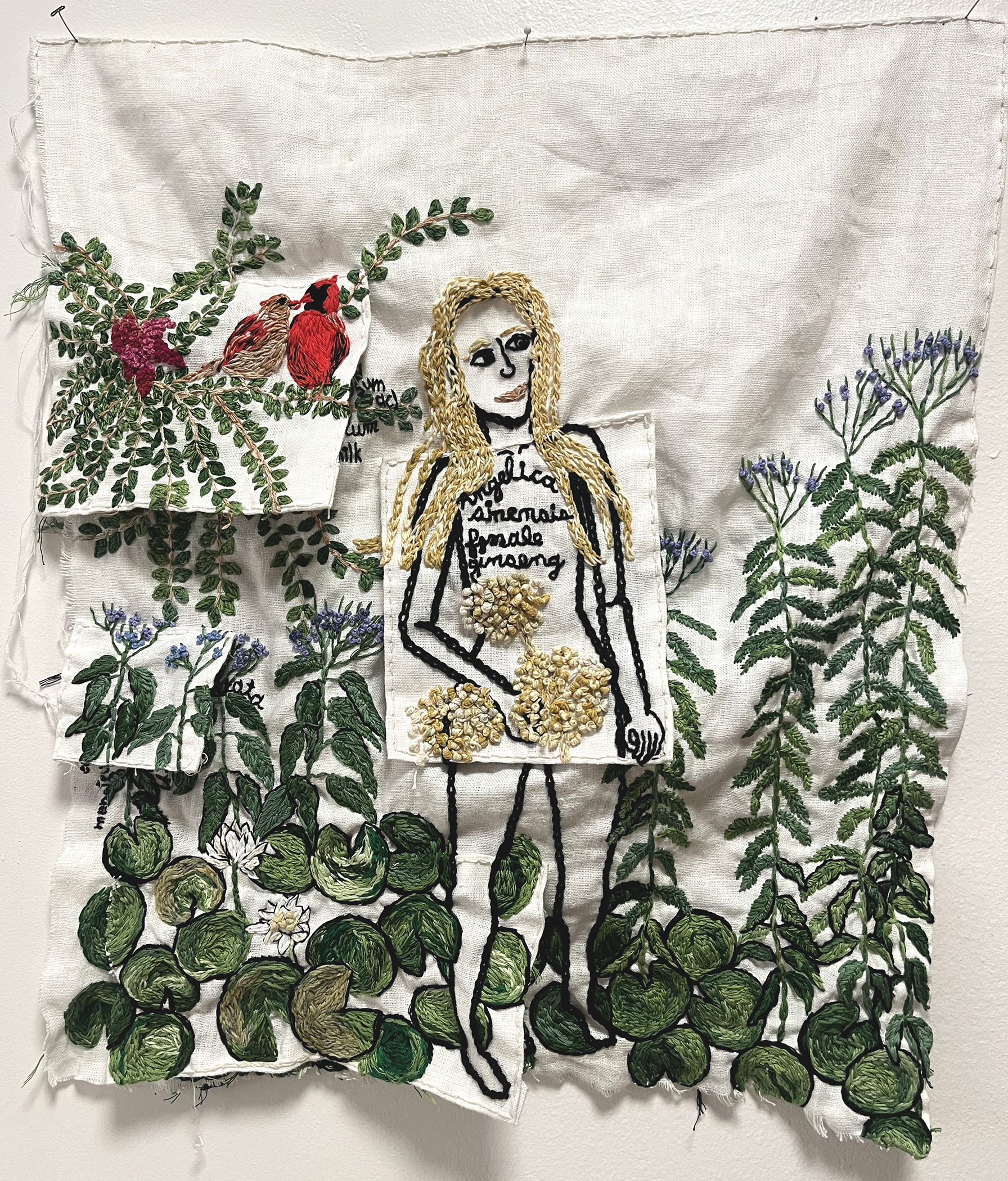 He can see the magic in the weeds and the forest for the trees. 2023. Embroidery on fabric. 9 x 7.5 inches. Pin It