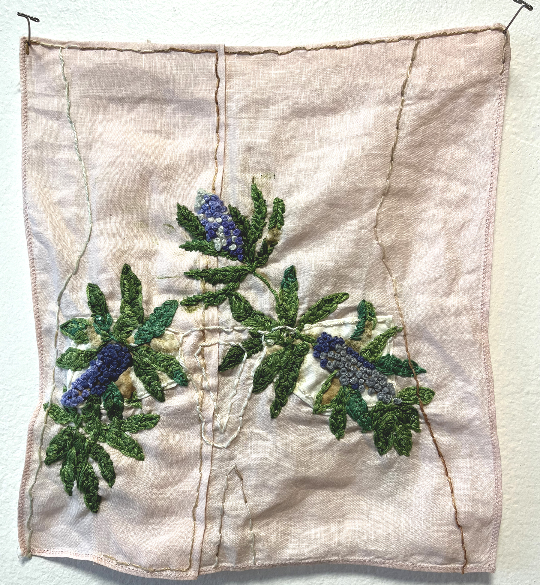 Vitex agnus-castus. 2024. Embroidery on fabric. 10 x 9 inches. Made for Smallish exhibit curated by Yeon Jin Kim, which traveled to South Korea and Japan, Winter-Spring 2025. Pin It