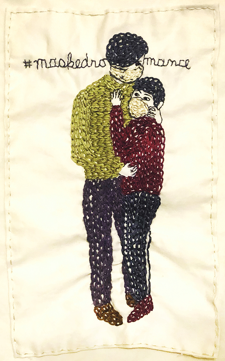 Masked romance. 2021. Embroidery on fabric. 6.75 x 10.75 inches. In a private collection. Pin It