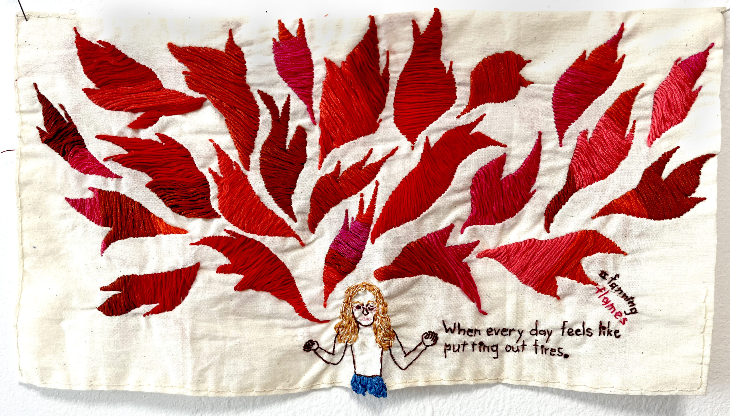 Fanning the flames. 2021. Embroidery on fabric. 8 x 15 inches. Pin It