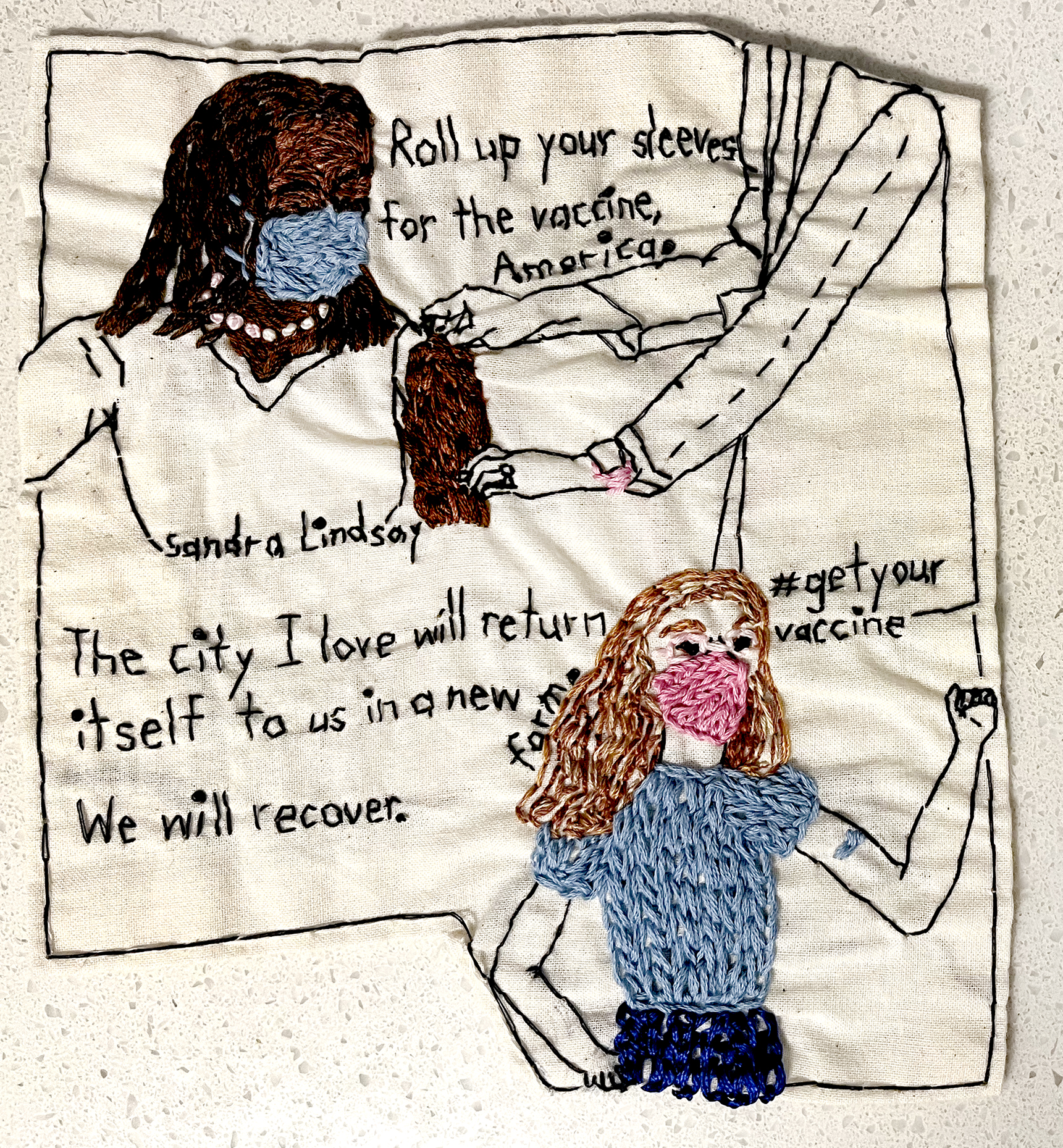 Roll up your sleeves for the vaccine. 2021. Embroidery on fabric. 7 x 6.5 inches. Pin It