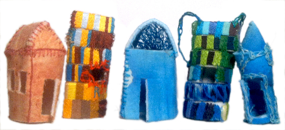 “Doll Houses, Tree Houses.” 2014. Paint and embroidery on fabric and trim with fabric stiffener. 7″ x 5″ x 3″.