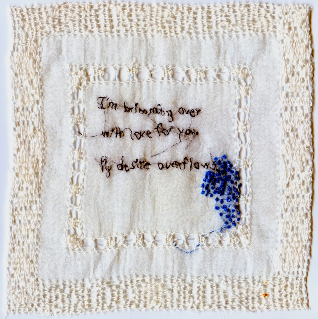 "I'm brimming over with love for you. My desire overflows." 2009. Embroidery on antique handkerchief. 5.5" X 5.5". Private Collection.