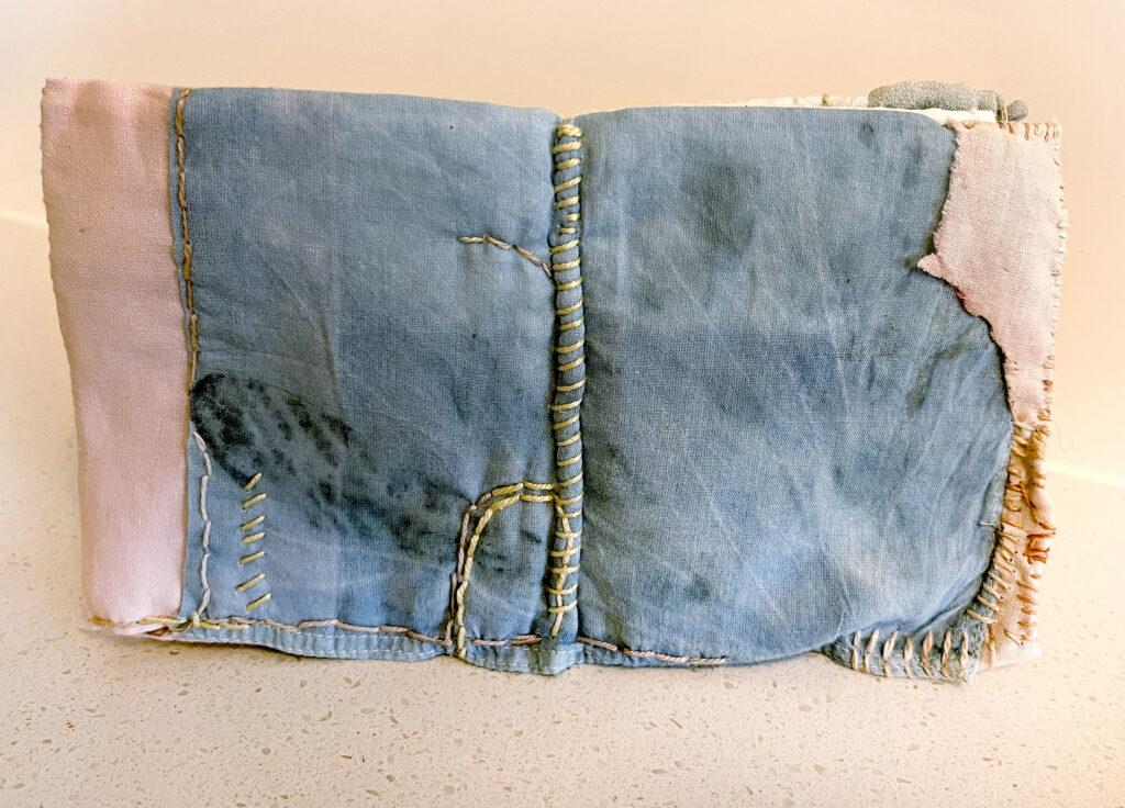 Seed Story. Fabric dyed and printed with indigo leaves and seeds; madder-dyed fabric; quilt batting; embroidery. 2024.