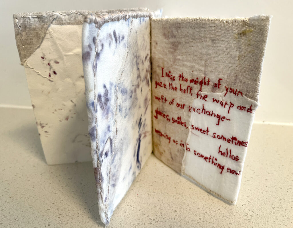 Hibiscus. 2025. Artists’ book with silk and cotton dyed and mono-printed with hibiscus, black beans, avocado and onion skin; heavyweight interfacing; embroidery.