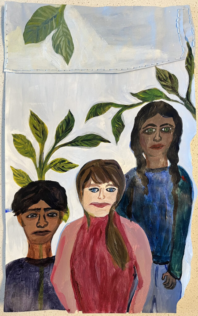 As if the Plant Were Inside Him. 2025. Acrylic on paper and fabric; leaf frottage with oil pastel; stitching. 15.25 x 9.5 inches