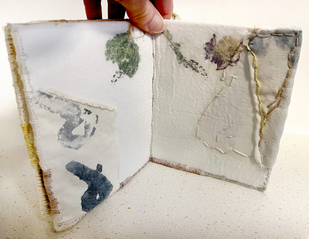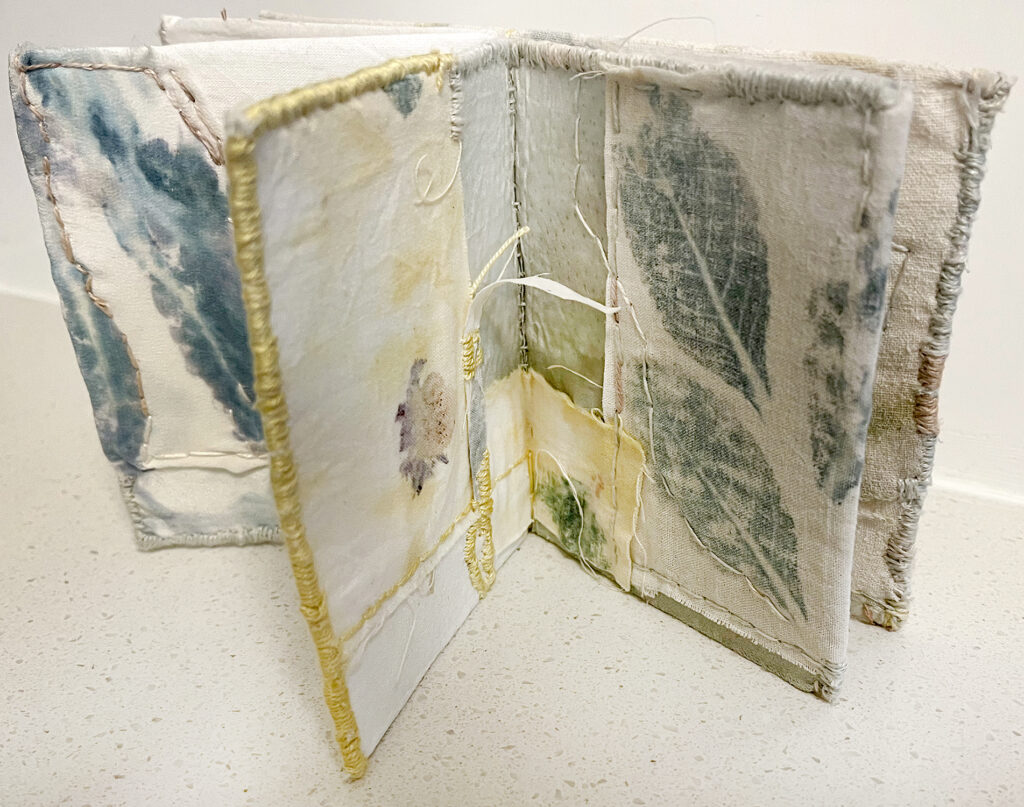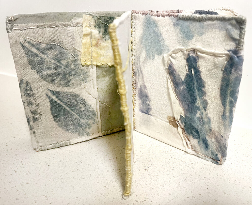 Garden Party. 2024. Artists’ book with plant mono-printed and dyed silk and cotton fabrics; appliqué, stitching, heavyweight interfacing. 5 x 8.5 x 4 inches.