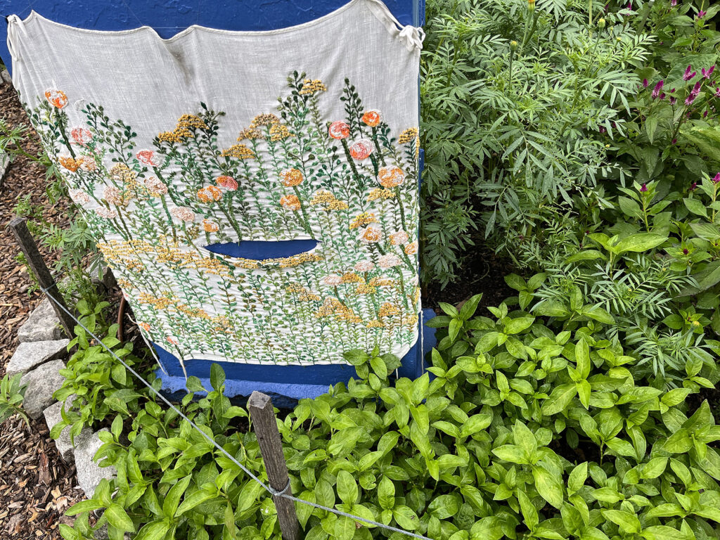 Botanical Bodies installation. 2022. Indigo (polygonum tinctorium) and marigolds grown from seed, embroidery on fabric. Embroidery: 30 x 29 inches