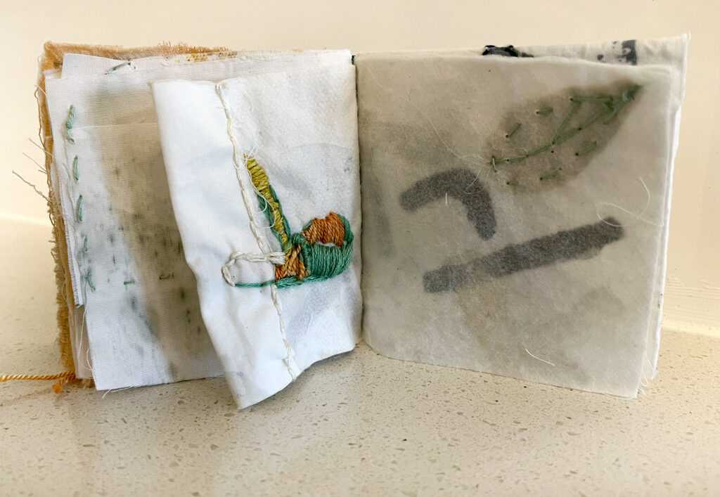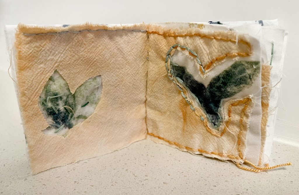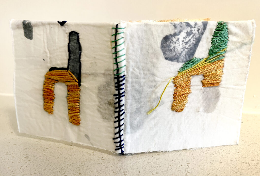 hR. 2025. Artists’ book. Cotton fabric, heavyweight and lightweight interfacing, embroidery mono-prints with indigo leaves and indigo, black bean and sulfur cosmos inks. 4 x 7.6 x 4.5 inches. Cover