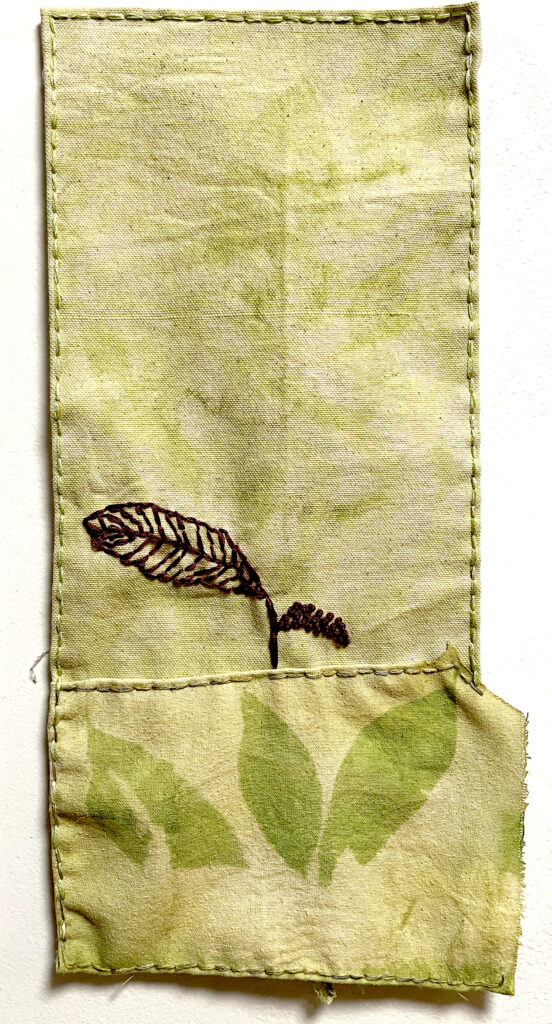 This was the start of a piece, which became what follows, Anthotype Collage, 2025-26. Anthotypes on silk and cotton fabric of indigo and red amaranth leaves on spinach emulsion, embroidery. 14 x 7 inches
