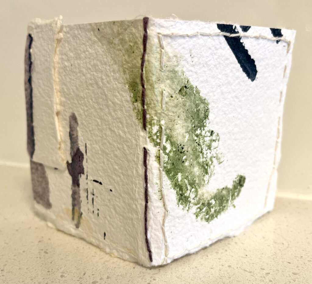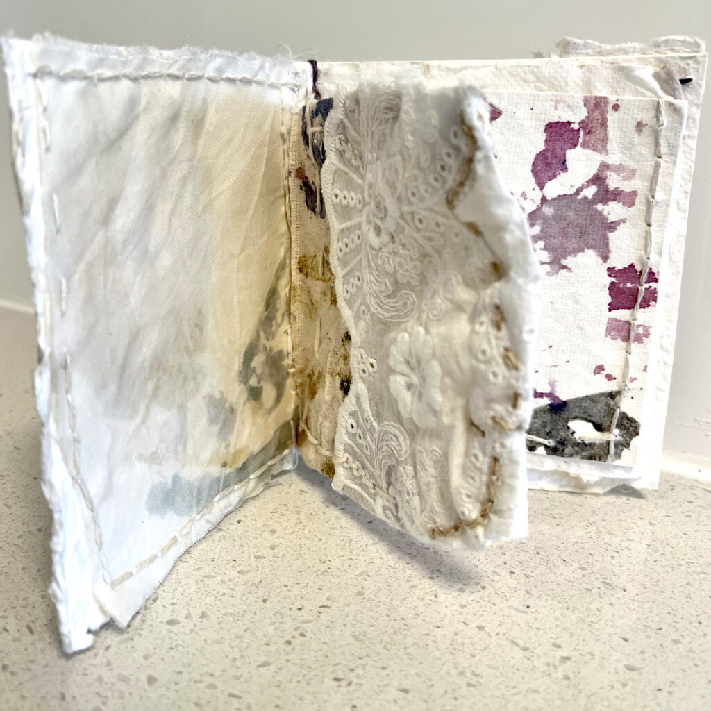 Spinach napkin. 2025. Artists’ book with cotton rag paper, cotton and silk fabric, napkin, quilt batting, plant mono-prints (spinach leaf, echinacea), plant inks (indigo, hibiscus, pomegranate peal), embroidery, appliqué. 4.5 x 6 x 3.75 inches.