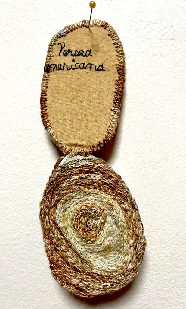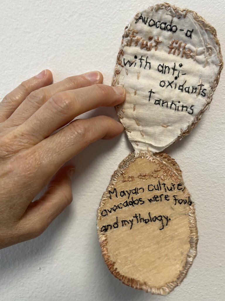 Persea americana (avocado). 2024. Embroidery on silk and cotton fabrics dyed with avocado skins and indigo; linen thread dyed with avocado skins, rust, indigo; heavyweight interfacing. 4 x 3 x 0.75 inches.