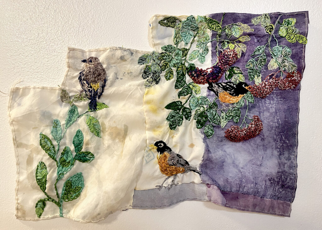Yellow-rumped warbler and two robins with elderberries and indigo. 2026. Embroidery on fabric painted with butterfly pea ink and hibiscus lake pigment and printed with indigo, hibiscus and onion skins. 11 x 14.5 x 1 inches
