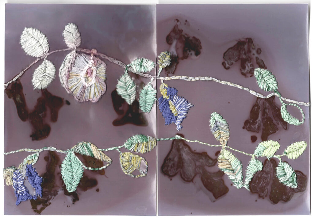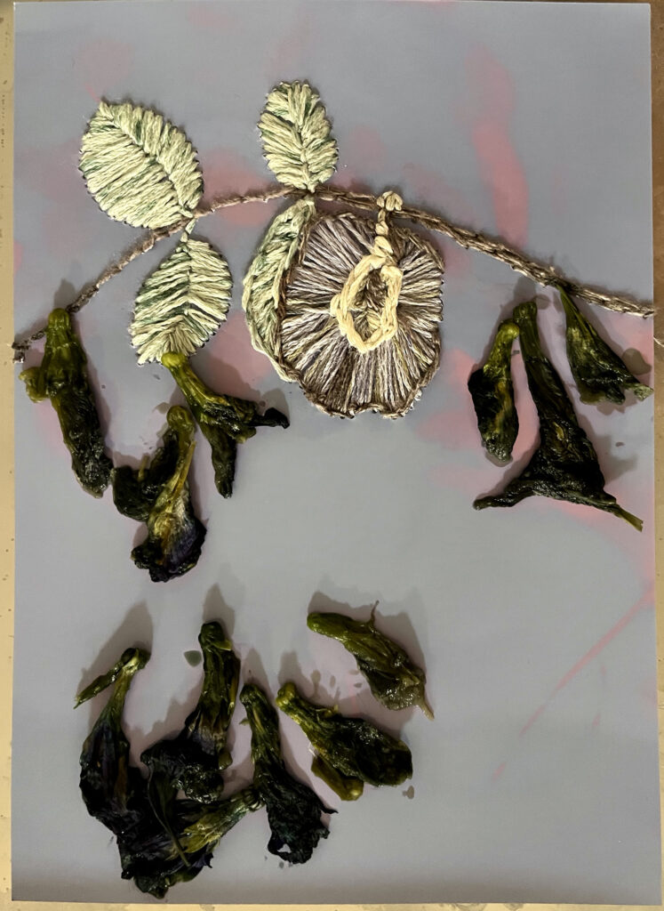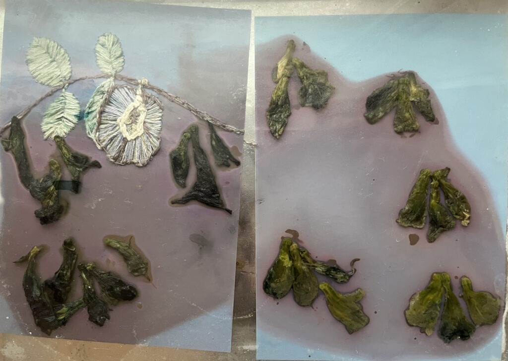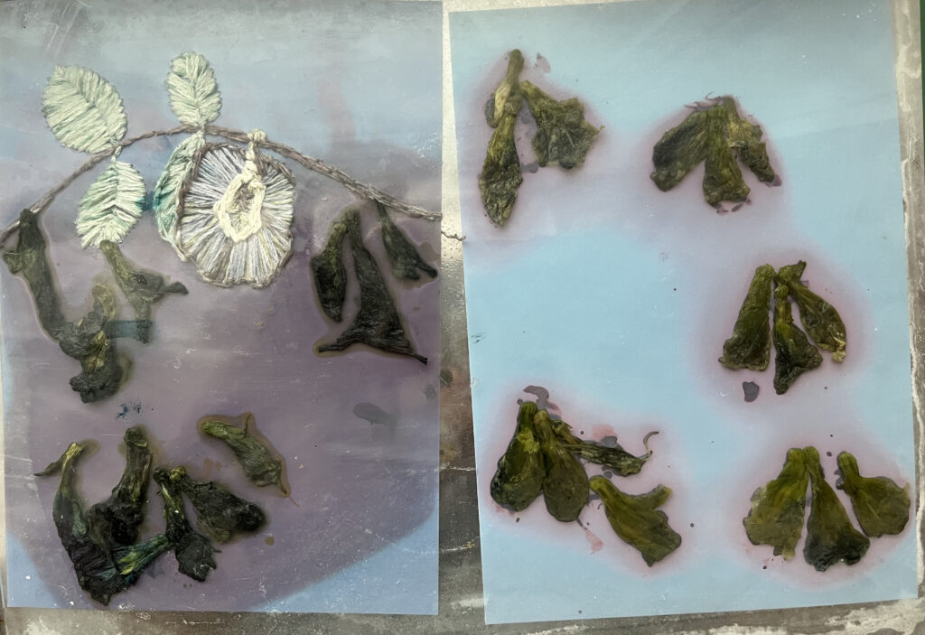 Butterfly pea flower. 2026. Diptych of embroidery on phytograms (plant-based photographs). 7 x 10 inches.